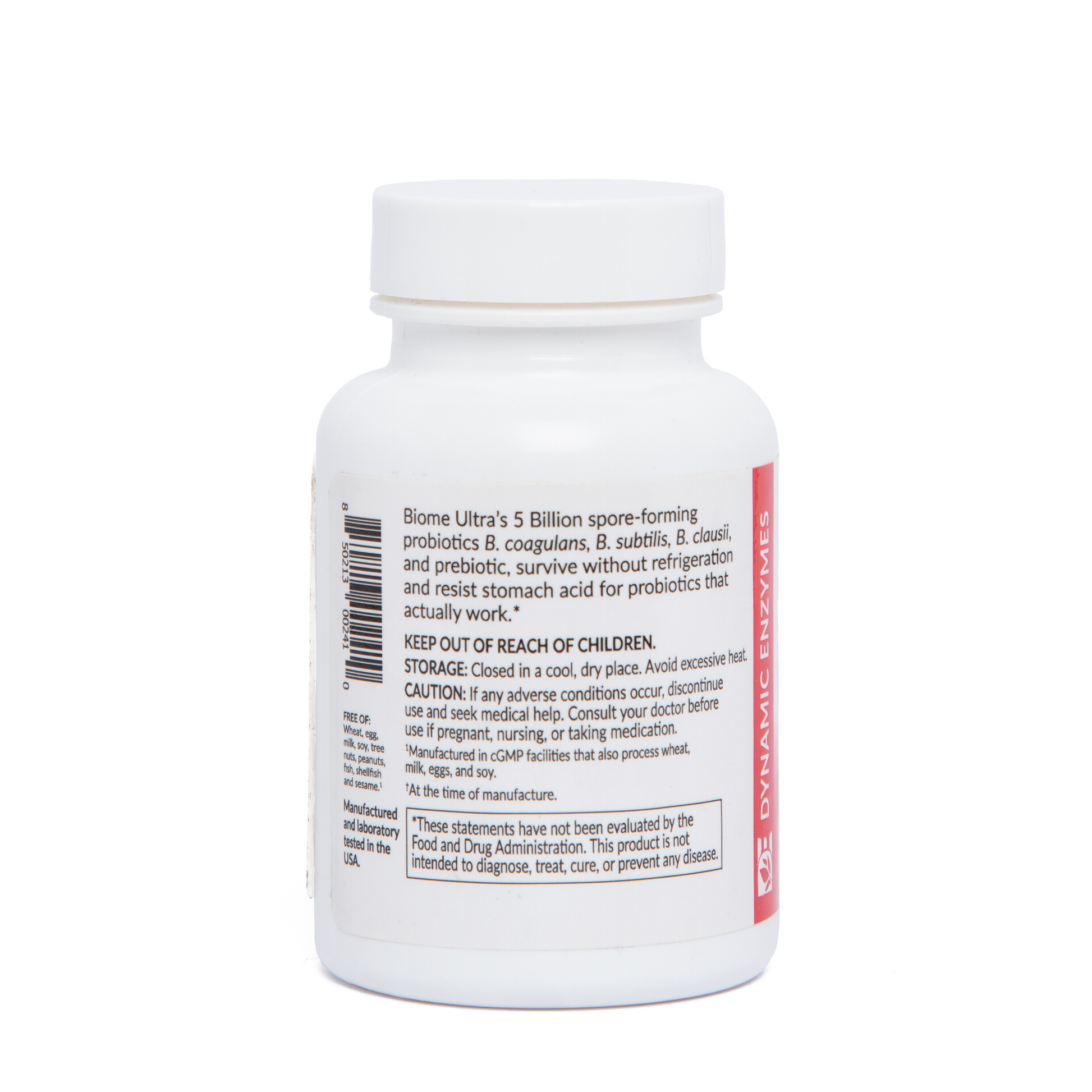 Biome Ultra is free of pesticides, chemicals, preservatives, animal derivatives, egg, milk, soy, wheat, peanuts, tree nuts, fish and shellfish. All enzyme ingredients are kosher-certified, and suitable for vegetarians and vegans.
